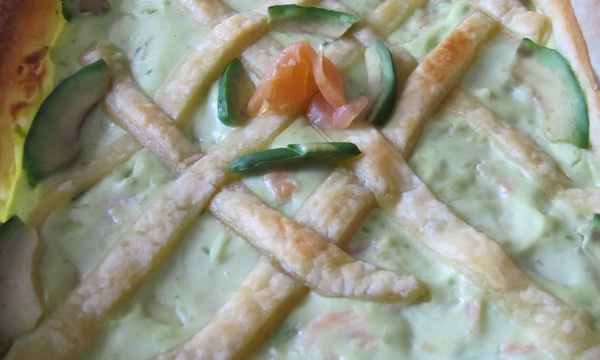 L'émietter, puis ajouter le à la crème d'avocat. Mélanger à la cuillère. Verser ce mélange sur la pâte. - 6