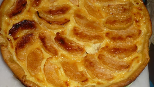 Recouvrir la pâte précuite avec la préparation à la crème, disposer les pommes.