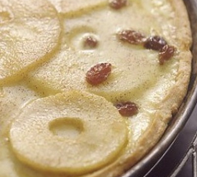 Etaler finement la pâte et découper un disque au format du moule. Cuire la pâte à blanc 10 mn à 180° (th. 6). Répartir alors la crème de coco dans le fond de la tarte. Disposer les rondelles de pomme et parsemer de raisins. Saupoudrer de cannelle.