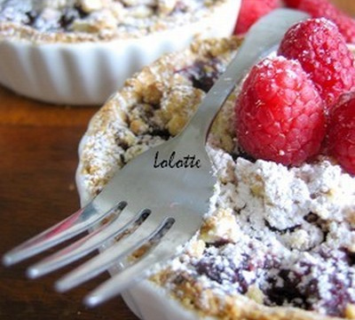 Ajoutez 2 cs de farine aux framboises, mélangez délicatement et déposez sur le fond de tarte. Saupoudrez du reste de mélange aux amandes. Répartissez le reste de la pâte en morceaux sur le dessus pour former le crumble.