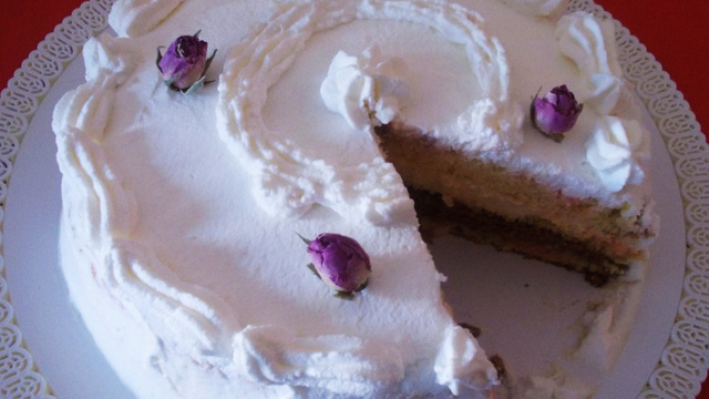Pour la décoration montez la crème et masquez tarte avec l'aide d'une spatule, vous pouvez choisir les motifs que vous voulez!