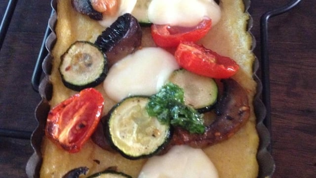 Répartissez les légumes sur la polenta, puis les billes de mozzarella. Enfournez pour 15 min, puis passez en mode grill et replacez le moule pendant 2 à 3 minutes, en surveillant que les légumes se colorent sans griller à l'excès.