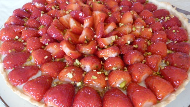 Répartir les fraises sur la tarte, disposer des éclats de pistaches. Si vous n'aimez pas les pistaches, vous pouvez remplacer par des amandes éffilés grillées.