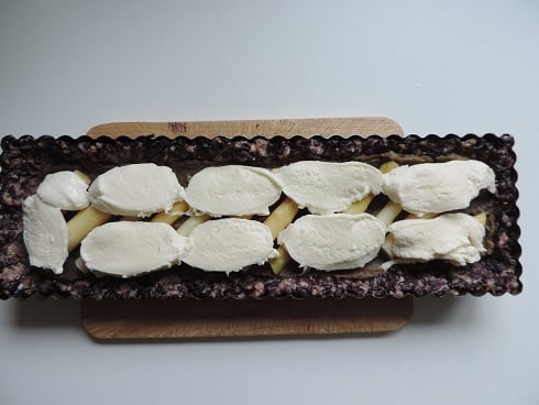 3Ensuite garnir la pâte cuite avec la crème d’artichaut étalée sur toute la surface. Déposer les asperges, puis la mozzarella saupoudrée de sarriette. Enfourner dans le four préchauffé à 180° pendant 15 min.