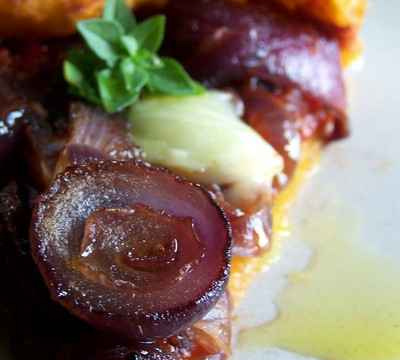Une délicieuse tarte sucrée-salée composée d'une compotée d'oignons rouges et de fromages Cabécou fondants