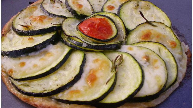 Lorsque le temps de pose est fini, déposer les tranches de courgettes sur la pâte joliement pour lui donner une forme de fleur.