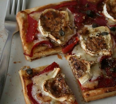Disposer des lamelles de poivron grillé et de rondelles de chèvre.