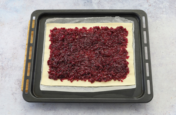 Étalez les oignons caramélisés sur la pâte, en laissant 1 cm de bord libre tout autour.