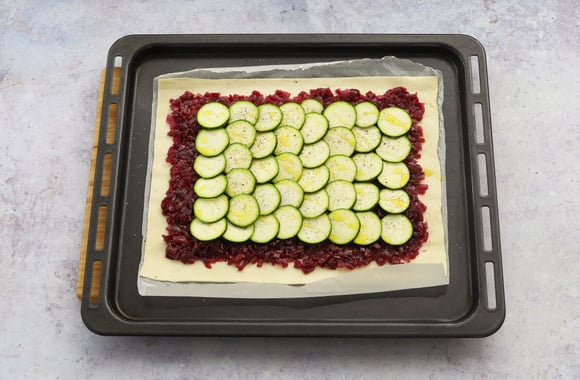 3Coupez les courgettes en rondelles fines, répartissez-les sur les oignons caramélisés en les faisant se chevaucher légèrement.