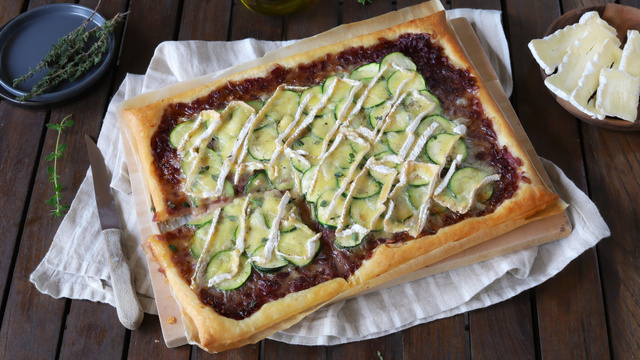 Une tarte fine originale et gourmande, avec du confit d'oignons maison et des courgettes qui se marient à merveille avec le Camembert fondu. Facile à préparer, cette tarte est idéale comme entrée ou comme plat, accompagnée d'une salade verte.