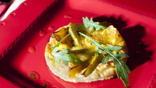Disposer la tarte au centre de l'assiette, placer quelques feuilles de roquette et tirer un trait de vinaigrette tout autour. Proposez le reste de vinaigrette avec une salade plus copieuse si vous souhaitez en faire une salade repas.