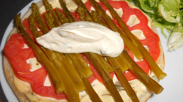 J'ai réalisé une tarte toute simple aux asperges et à la tomate. Accompagnée d'une quenelle de fromage St Môret et moutarde. Un délice.