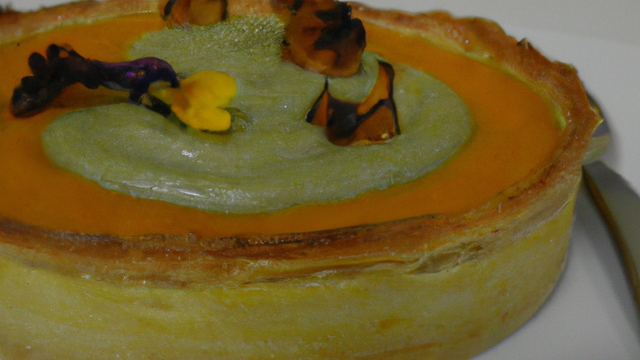 Des légumes croquants sur une pâte sablée, le tout parfumé à la Fourme d'Ambert.
