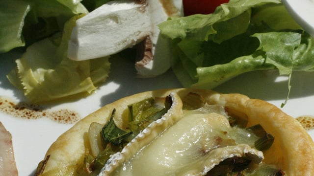 Détailler 8 cercles dans la pâte feuilletée, y déposer les poireaux pré-cuits, et mettez à cuire 10 min au four préchauffé à 180°C. Au bout de ces 10 min, déposer une lamelle de Feuille de Dreux sur chaque tartelette puis remettre au four 2min.