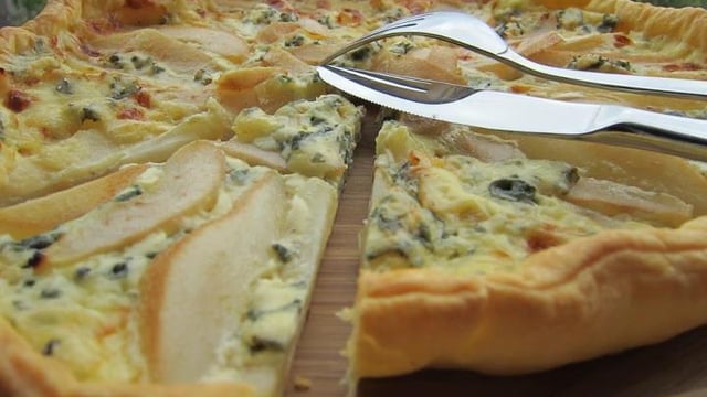 Chemisez votre moule à tarte avec la pâte feuilletée sans oublier d'enlever le papier cuisson vendu avec car il va ramollir votre pâte à la cuisson. Pelez la poire, coupez la en 4 et retirer les graines. Détaillez la poire et la fourme en lamelles de 1cm d'épaisseur maximum.