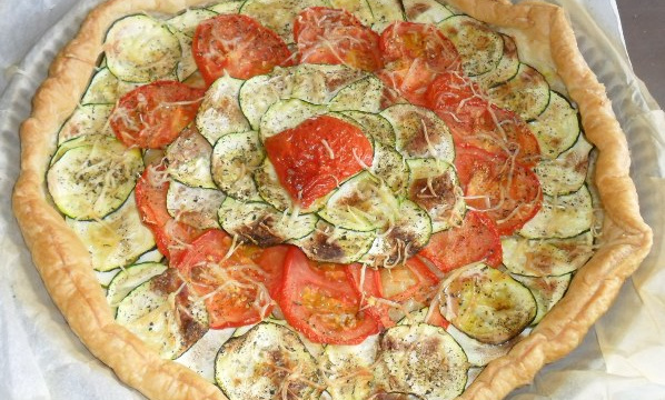 Placez votre pâte feuilleté dans un moule a tarte puis mettre la moitié de gruyère, ensuite vos courgettes et tomate en rond comme sur la photo