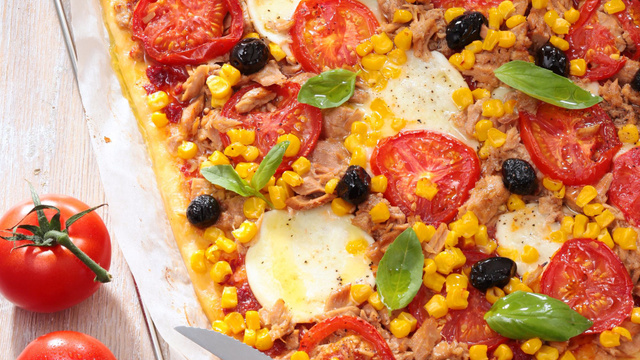 Détaillez la mozzarella en fines tranches. Égouttez le maïs et le thon. Déroulez la pâte à pizza sur une plaque de cuisson recouverte de papier sulfurisé. Tartinez-la généreusement de concentré de tomates. Ajoutez les rondelles de tomates, les tranches de mozzarella, le thon émietté, le maïs et les olives noires. Salez et poivrez.