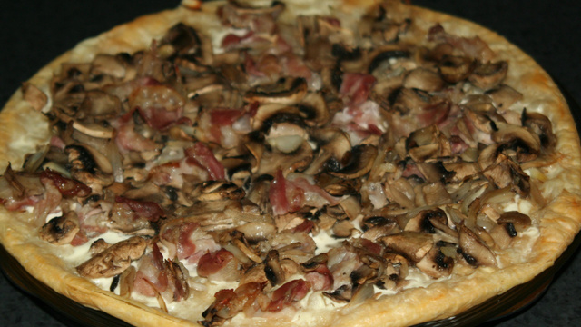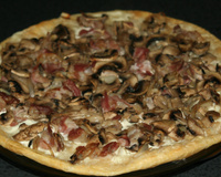 Faire chauffer la pâte feuilletée que vous aurez percée de quelques trous à la fourchette pour éviter qu'elle ne gonfle au four à 200°C. Pendant ce temps faire revenir dans un filet d'huile d'olive l'oignon émincé, puis les champignons coupés en rondelles et le lard fumé coupé en morceaux.