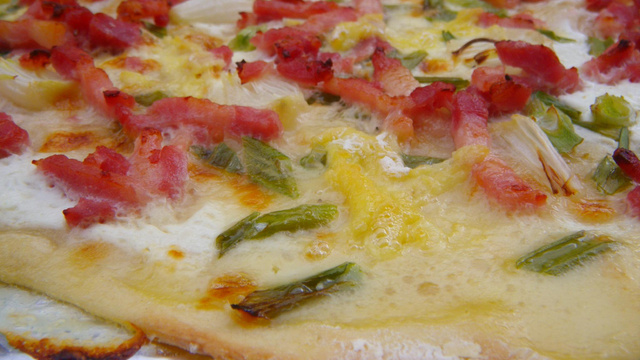 Une tarte flambée revisitée où les ciboules remplacent les oignons et où le Saint Marcelin apporte une touche gourmande.