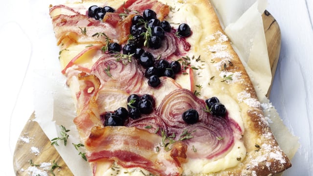 Lavez et essuyez les pommes. Enlevez le trognon avec un emporte-pièce. Coupez les pommes en fines tranches rondes. Recouvrez la pâte de façon régulière avec les myrtilles, les tranches de bacon, d'oignons et de pommes. Faites cuire la pâte dans le four préchauffé à 225 °C (four à convection: 200 °C/ four à gaz: 4) pendant 18-20 minutes.