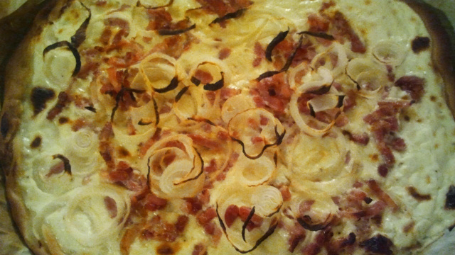 Important, il faut que votre four soit très chaud. Comme je n'ai pas de pâte à pain, j'ai pris une pâte à pizza. L'histoire dit qu'apparemment cette tarte était faite avec les restes de pâte à pain.