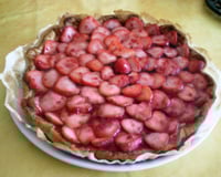 En garnir le fond de tarte cuit, bien homogénéiser. Déposer les lamelles de rhubarbe sur le dessus, en quinconce si besoin et en coupant les morceaux qui dépassent si elles sont trop longues. Décorer de fraises et réserver la tarte au frais.