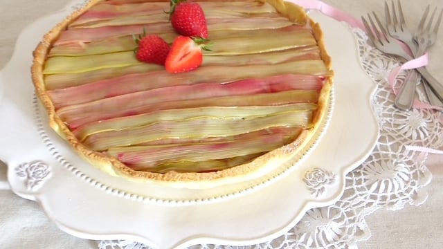 Une tarte délicatement présentée de lamelles de rhubarbe confite qui laisse entrevoir, une fois coupée, une succulente crème pâtissière à la fraise.