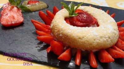 Dans l'assiette poser un cercle à mousse du diamètre des tartelettes. Verser quelques cuillerées de compotée de rhubarbe, ajouter les fraises coupées en dés. Répartir la crème à la rose à l'aide du syphon. Retirer le cercle. Poser le fond de tartelette sablée à l'envers sur la compotée de fruits. Décorer le centre et le tour de la tarte avec quelques lamelles de fraises. Saupoudrer de sucre glace.
