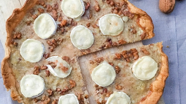 Dans un saladier, mélangez les œufs, le lait, les noix concassées ainsi que le confit d’oignons.