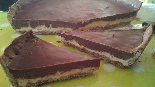 Cette tarte est faite grâce à une pâte sablée parfumée au cacao ainsi que de la glace de votre choix (ici vanille) et une ganache au chocolat.