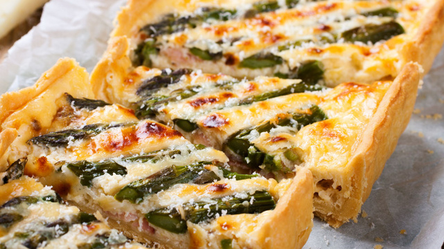 Foncer un moule rectangulaire avec la pâte brisée. Piquer le fond de tarte. Parsemer les 3/4 de parmesan dessus. Déposer les asperges alignées. Verser l’appareil puis recouvrir du reste de parmesan. Faire cuire 30 minutes à 180°C.