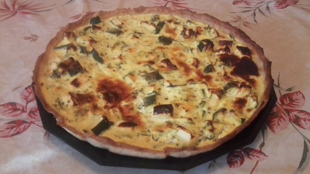 - Lavez et decoupez les courgettes en julienne et les olives en rondelles. Etalez le tout aufond de la tarte et versez le melange fromage blanc/oeufs par dessus.