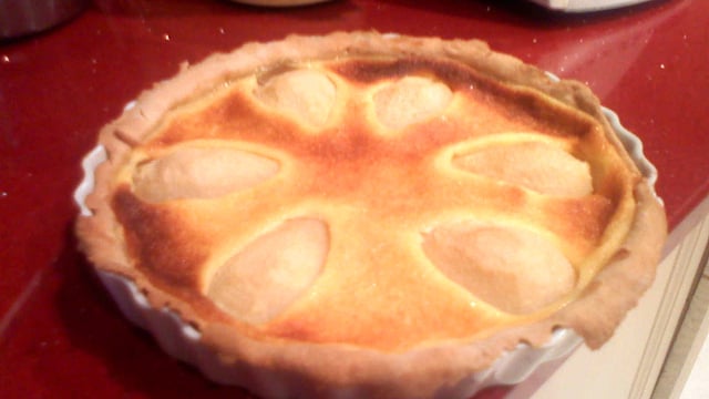 - 2Mettre dans un moule à tarte la pâte et la piquer avec une fourchette.Disposer sur la pâte les poires égouttées et coupées en deux.