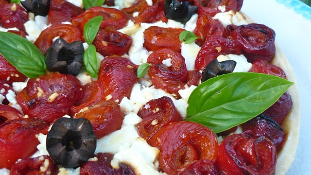 Une tarte généreuse et équilibrée composée de poivrons grillés, feta, olives et basilic.