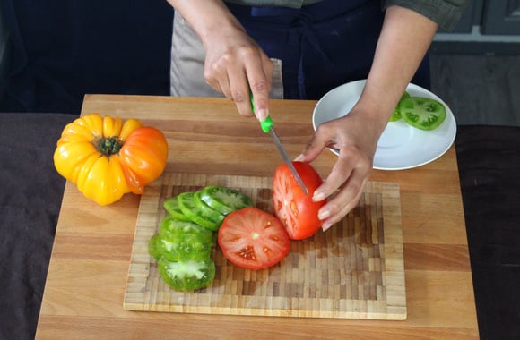 1Tranchez les tomates en rondelles fines et les tomates cerise en deux.