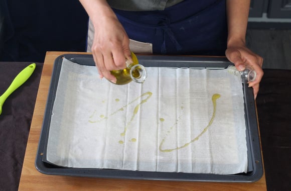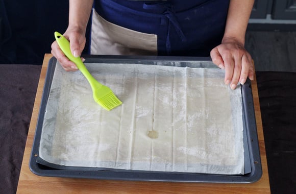 2Sur une plaque recouverte de papier sulfurisé, placez une feuille de pâte fillo, arrosez avec un filet d'huile d'olive.