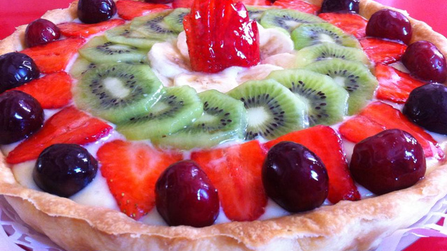 Tarte aux fruits avec une pâte brisée faite maison et des fruits frais (fraise, banane, kiwi et cerises).