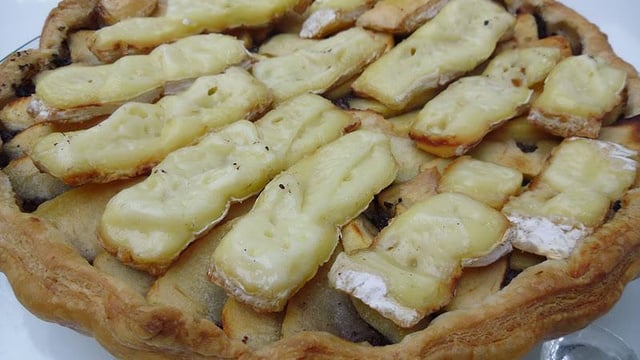 Une tarte au pommes, boudin (ou lardons selon les goûts) et camembert, avec un appareil d'oeufs et de crème fraîche