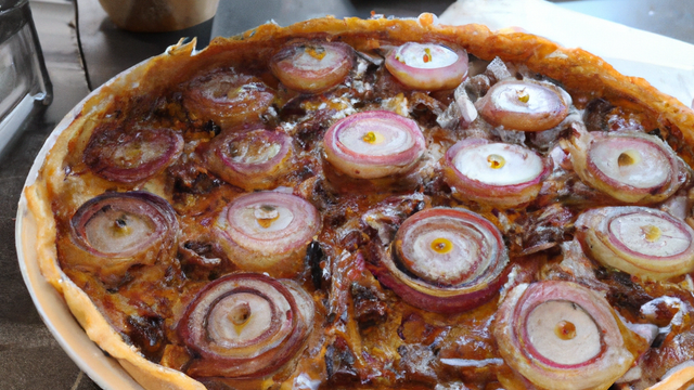 Sur une pâte brisée faite à la main, déposer les oignons revenus et assaisonnés et garnir le dessus avec les tranches de magret séché.