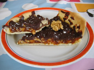 Tarte noix, caramel miélé et chocolat.