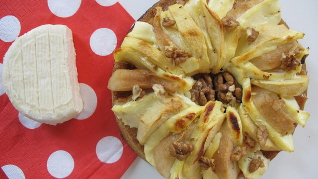 - Lorsque le fond de tarte est cuit, disposer de façon harmonieuse, les lamelles de poires/pommes et Saint Marcellin