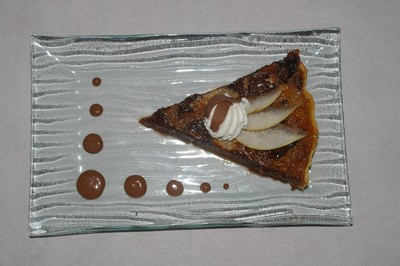 Tarte avec des poires et des morceaux de chocolat.