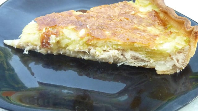 Sur la pâte brisée, étalez votre préparation au poulet, puis vos courgettes cuites.