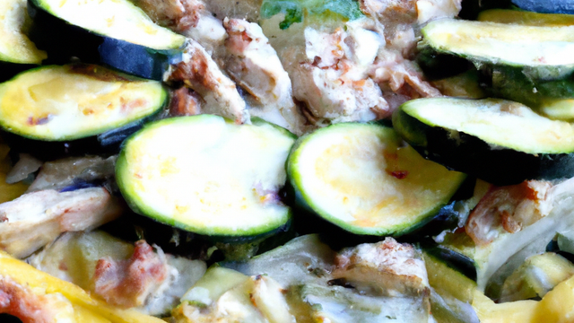 Piquez la pâte brisée, répartissez le poulet, puis les courgettes et enfin la préparation au fromage.