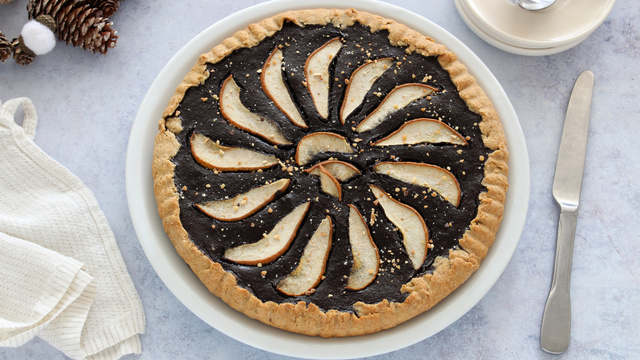 Une tarte au chocolat et poire sans œufs, sans beurre et sans lait. Elle convient à une alimentation vegan, mais elle fera des heureux aussi chez les personnes qui ne suivent pas ce type d'alimentation.
