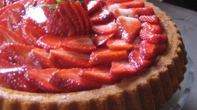 Une tarte bien rafraîchissante , une base aux amandes, une délicieuse mousse fraises mascarpone et pour finir de jolies fraises !