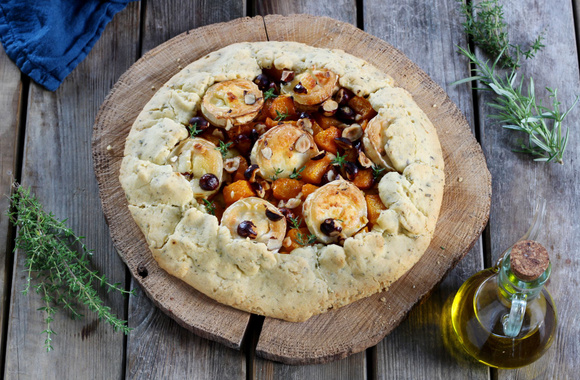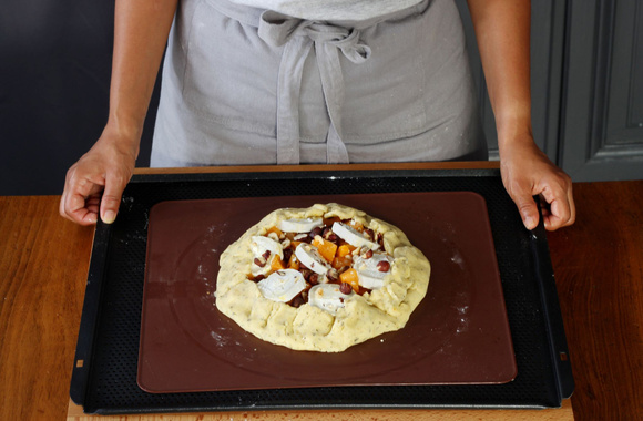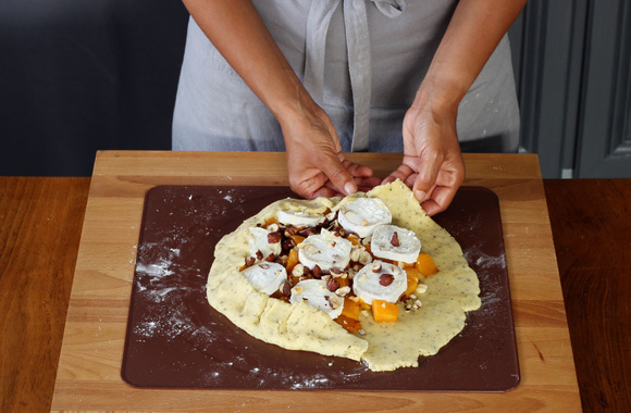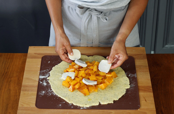 7Répartissez les dés de potiron au centre de la pâte en laissant une bordure de 3 cm. Ajoutez les rondelles de chèvre.