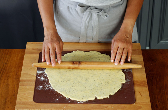 Étalez la pâte à l'aide d'un rouleau à pâtisserie sur un plan de travail fariné de manière à obtenir une sorte de galette ronde d'environ 3 mm. d'épaisseur.