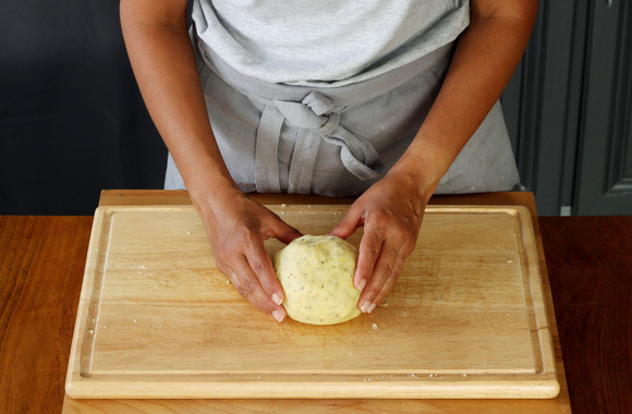 3Mélangez le tout sans trop pétrir et formez une boule dès que la pâte est homogène. Enveloppez la pâte de film alimentaire et laissez reposez au frais pendant 30 min.