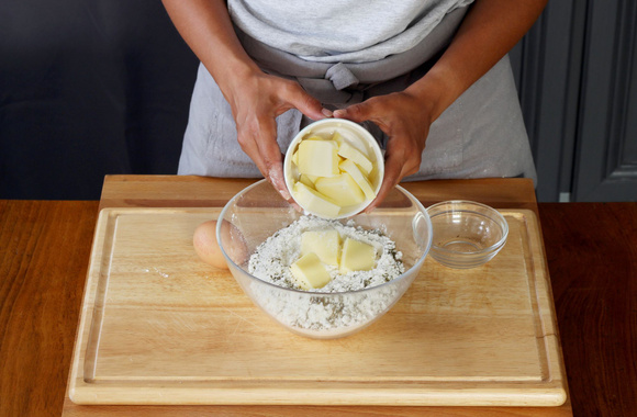 1Versez dans un saladier la farine, l'origan séché, le sel et le beurre découpé en petits dés.